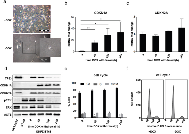 Figure 2: a. Light microscopic comparison of passage 10 DKFZ-BT66 cells grown in the presence of doxycycline (+DOX; 1 μg/ml) and cells cultivated in the absence of doxycycline (-DOX) for 21 days. Cells grown in the absence of doxycycline show enlarged, round and flattened cell bodies as compared to a small spindle like phenotype observed in cells proliferating in the presence of doxycycline. b, c. Fold changes of CDKN1A (p21) and CDKN2A (p16) mRNA in DKFZ-BT66 cells after doxycycline withdrawal normalized to the level in cells cultured in the presence of 1 μg/ml doxycycline (0 hours). n=3, significant differences are indicated as: ** p<0.01 and * p<0.05. Depicted are mean +/- SD d. Western blot analysis of total cell lysates. DKFZ-BT66 cells were seeded in full medium supplemented with 1μg/ml doxycycline and medium was replaced by doxycycline-free medium 24 hours later. Cells were lysed after the indicated time in the absence of doxycycline. BT-40 and HEK293T were cultured in normal growth medium without doxycycline before lysis e. Changes in cell cycle distribution after the indicated culture time in the absence of doxycycline. An increase in G1-phase and a significant reduction (*p<0.05) in S-phase cells was detected as compared to control (0 hours) (n=3). Depicted are mean +/- SD f. Representative cell cycle histograms of DKFZ-BT66 cells cultured in the presence (+DOX) or absence (-DOX for ten days) of doxycycline for ten days, respectively.