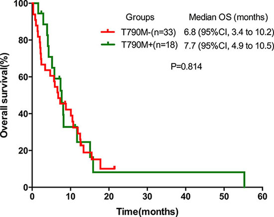 The PFS from the commencement of the secondary EGFR-TKIs did not differ significantly between the T790M-positive and the T790M-negative groups (1.8 months, 95% CI 1.2–2.4 vs. 2.0 months, 95% CI 1.1–2.9, P = 0.261) (Figure 1). Similar results were observed for the median OS (7.7 months, 95% CI 4.9–10.5 vs. 6.8 months, 95% CI 3.4–0.2, P = 0.814) (Figure 2), ORR (0.0% vs. 12.1%, P = 0.284) and DCR (33.3% vs. 36.4%, P = 0.829).