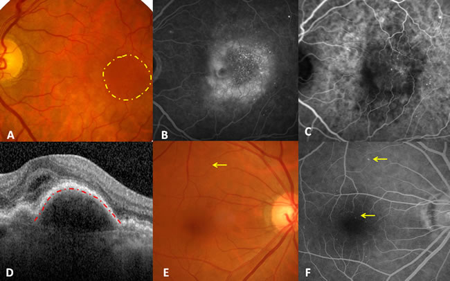 Figure 1. Illustration of diabetic choroidal microvascular proliferation. A. Fundus photography demonstrating sporadic retinal microaneurysms and a submacular round dark reflection involving the fovea (yellow circle), without drusen. B. Late stage of fluorescein angiography showing macular leakage, multiple hyperfluorescent dots, and the normal background fluorescence originating from RPE except for leakage. C. Late stage of indocyanine green angiography indicating multiple hyperfluorescent dots and CNV. D. Foveal horizontal optic coherence tomography showing subfoveal fluid together with RPE detachment (red line). E. Fundus photography of the right eye only demonstrated macular retinal microaneurysms. F. Late-stage fluorescein angiography of the right eye revealed more retinal microaneurysms and normal background fluorescence originating from the RPE.