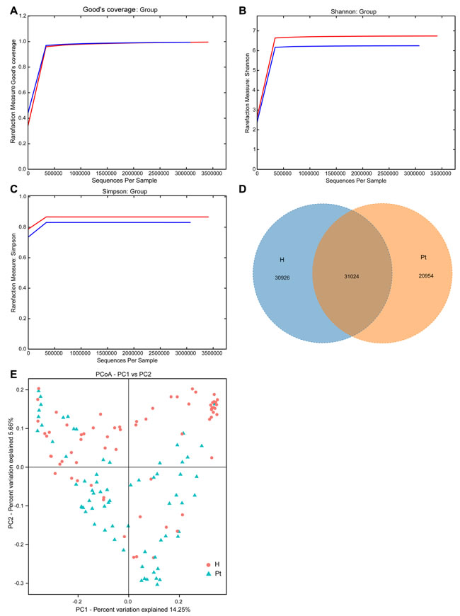 Good’s coverage indicated sufficient depth for the investigation of T2DM-associated urinary microbiota (Figure 1A). Both Shannon and Simpson indices illustrated the urinary microbiota diversity was lower in T2DM patients than in HCs (Table 2 and Table S1; Figure 1B and 1C). In the richness indices, ACE and Chao1 were lower in T2DM patients than those in HCs (Table 2 and Table S1). Interestingly, when correlation analyses between microbiota diversity and richness indices and participants’ age were conducted, no significant correlations were found (Table S2). A Venn diagram demonstrated 31,024 of the total 82,904 OTUs were shared between the two cohorts (Figure 1D). To measure the extent of the similarity of microbial communities, beta diversity was calculated using unweighted UniFrac and principal coordinate analysis (Figure 1E). The heatmap showed that the two cohorts were partially clustered (Figure S1).
