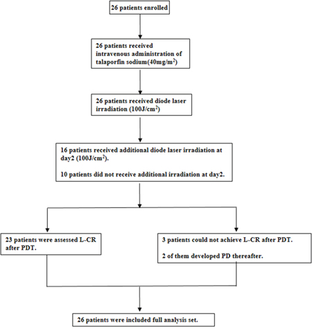 Figure 1: The flow of study. 26 eligible patients were enrolled and all completed the intravenous administration of talaporfin sodium followed by diode laser irradiation and were included full analysis set. While 16 patients received additional laser irradiation, the remaining 10 patients did not. 23 patients were assessed local complete response (L-CR), and the other 3 patients could not achieve L-CR after PDT.