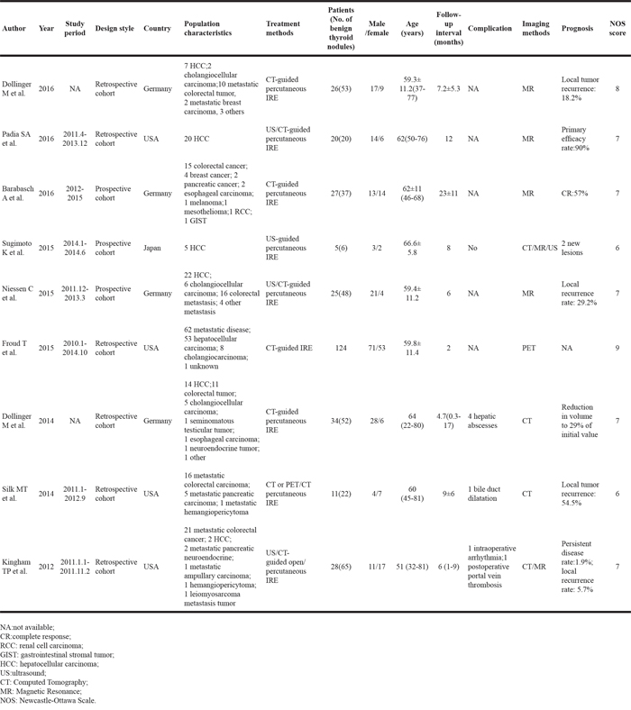 We finally identified from 9 studies of hepatic malignant tumors representing a total of 300 patients (male: 182; female: 118). Two thousand one hundred and thirty-eight studies were ineligible for inclusion according to predefined search strategies until July 26th, 2016 (Figure 1). Table 1 summarized the characteristics of the 7 retrospective and 3 prospective cohort studies with the mean follow-up between 2 and 23 months. The mean age of included participants ranged from 51 to 66.6 years. The treated tumors in these studies of recent decades mainly included primary and metastatic hepatic disease, in which US/CT-guided percutaneous IRE became the main treatment methods. Furthermore, it showed IRE had a few major complications including 4 hepatic abscesses, 1 bile duct dilatation, 1 arrhythmia, 1 portal vein thrombosis in Table 1 and these patients in this study had a better prognosis. Most of these observational studies were of good quality ranging from 6 to 9 scores using the Newcastle-Ottawa scale. Risk of bias was described in Supplementary Table 1.