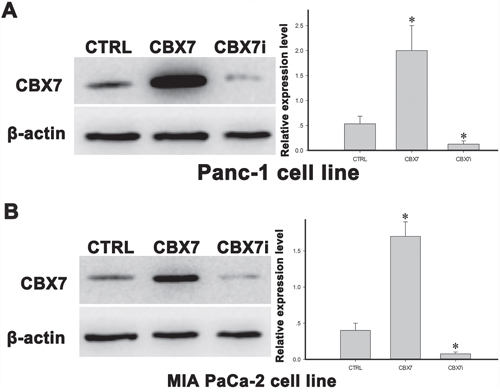 Figure 1: The establishment of stable CBX7-overexpressing and CBX7-knockdown pancreatic cell lines. Panc-1 and MIA PaCa-2 pancreatic cancer cells were infected with Control (CTRL), CBX7-overexpressing (CBX7) and CBX7-interfering (CBX7i) lentivirus. The cells were later subjected to puromycin selection to obtain stably infected cell lines. Western blot analysis was conducted to determine the protein level of CBX7 in Panc-1 A. and MIA PaCa-2 B. cells. (* P<0.05, compared with the CTRL group).