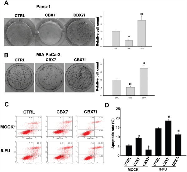 Figure 2: Determination of the colony formation capacity, viability, and chemoresistance of CTRL, CBX7, and CBX7i pancreatic cancer cells. 500 cells of the indicated groups of Panc-1 A. and MIA PaCa-2 B. cells were seeded into 6-well plates and incubated for 10 days. The colonies formed were fixed by paraformaldehyde and stained with 0.5% crystal violet. C. Annexin-V/PI analysis of cell viability and chemoresistance of CTRL, CBX7, and CBX7i pancreatic cancer cells. Pancreatic cancer cells were treated with or without 50 μg/ml 5-FU and subjected to annexin-V/PI apoptotic assay. D. The bar chart showed the apoptotic rate of the indicated groups. (* P<0.05, compared with the control groups (CTRL); # P<0.05, compared with 5-FU-treated CTRL cells).