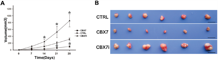 Figure 4: Analysis of the in vivo tumorigenesis of CTRL, CBX7, and CBX7i pancreatic cancer cells using xenograft tumor assay. CTRL, CBX7, and CBX7i pancreatic cancer cells were subcutaneously injected into the flanks of nude mice. The tumor volumes were measured weekly. A. The growth curves of CTRL, CBX7, and CBX7i tumors were measured and presented. (* P<0.05, compared with the control groups (CTRL)). B. The representative images of xenograft tumors in the indicated groups (Scale bar, 10 mm).