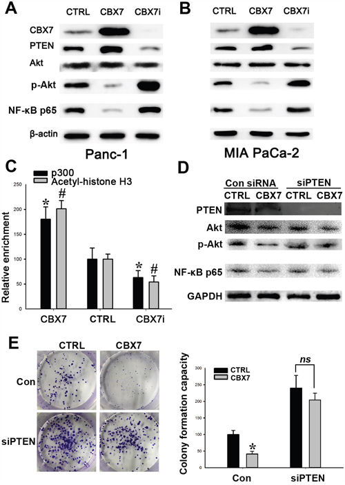 Figure 5: CBX7 suppresses PTEN/Akt/NF-κB signaling in pancreatic cancer cells. CTRL, CBX7, and CBX7i Panc-1 A. and MIA PaCa-2 B. cells were subjected to western blot to determine the expression of PTEN, p-Akt, and NF-κB p65. C. CBX7 promotes p300-PTEN promoter binding and Histone H3 acetylation in pancreatic cancer cells. CTRL, CBX7, and CBX7i Panc-1 cells were subjected to CHIP assay to determine the enrichment of p300 and acetylated Histone H3 on PTEN promoter. (*,# P<0.05, compared with the control group.) D. Depletion of PTEN abrogated the suppressive effect of CBX7 on PTEN/Akt/NF-κB pathway. CTRL and CBX7 panc-1 cells were transfected with PTEN siRNA pool. 48 h after transfection, the cells were subjected to western blot analysis to determine the levels of PTEN, p-Akt and NF-κB p65 in the indicated groups of cells. E. Depletion of PTEN significantly impaired the effect of CBX7 on the colonly-formaing capacities of pancreatic cancer cells. Determination of the colony-forming capacities of the indicated groups of cells. (* P<0.05, compared with the control group; ns, no statistical difference).