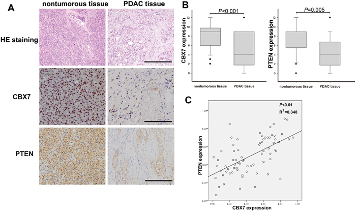 The correlation between CBX7 and PTEN expression in pancreatic cancer tissues