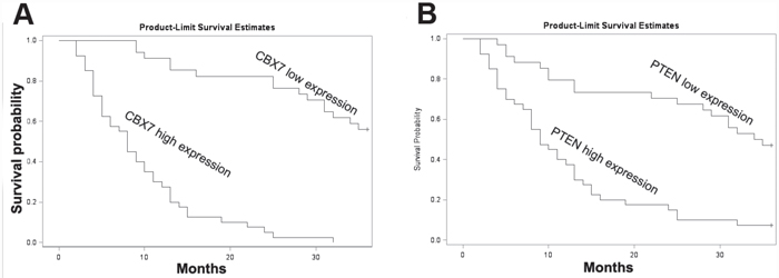 Figure 7: CBX7 and PTEN expression was strongly associated with the overall survival (OS) of 74 PDAC patients (P<0.05, log-rank test). A, B. Kaplan-Meier survival curve was presented according to CBX7 expression (A) and PTEN expression (B) assessed by IHC scores.