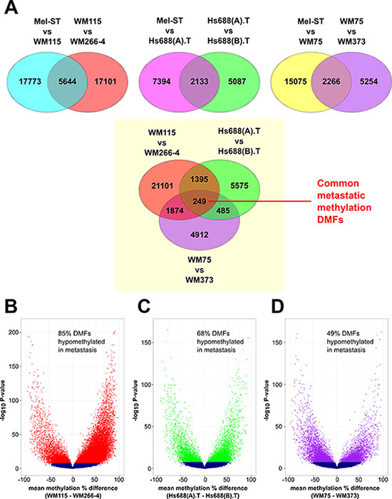 Figure 2: Strategy and landscape of differential methylation in melanoma metastasis. (A) Details of the differential methylation analysis. The comparisons between the cell lines are written on the top of each Venn diagram and the number indicates the differentially methylated fragments (DMFs) in each of these comparisons. (B–D) Volcano plots showing the methylation changes between each metastatic cell line compared to the matched primary cell line. The mean methylation changes for the analysed fragments between the pairs are represented on the x-axis. Blue indicates fragments that were not significant. The DMFs were represented by red (for WM115 vs. WM266-4), green (for Hs688(A).T vs. Hs688(B).T) and purple (for WM75 vs. WM373). The y-axis shows the -log10 of the P-values.