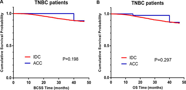 Figure 3: Kaplan–Meier curves of breast cancer-specific survival (BCSS, A) and overall survival (OS, B) based on histology for triple-negative breast cancer (TNBC) patients, adenoid cystic carcinoma (ACC) vs. invasive ductal carcinoma (IDC).