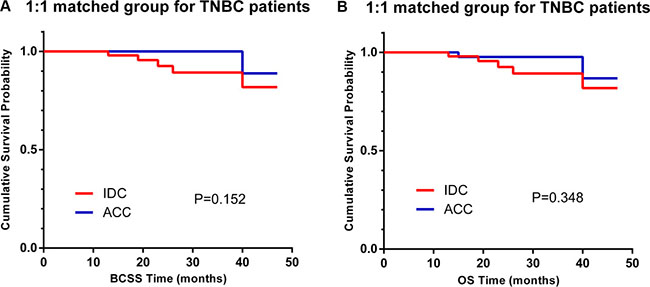 Figure 4: Kaplan–Meier curves of breast cancer-specific survival (BCSS, A) and overall survival (OS, B) based on histology for 1:1 matched triple-negative breast cancer (TNBC) patients, adenoid cystic carcinoma (ACC) vs. invasive ductal carcinoma (IDC).