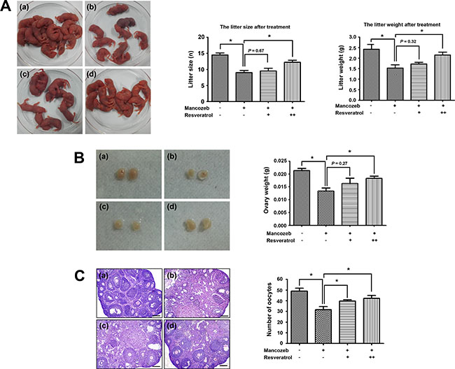 Figure 1: Effect of resveratrol on mancozeb reduced fertility. (A) Mancozeb treated mice showed a significantly reduced average offspring. Resveratrol treatment could protect against mancozeb effect, acting on both litter size and litter weight. (B) Ovaries in mancozeb treated mice were also significantly smaller when compared with those of controls. Resveratrol could protect against mancozeb inducing ovary weight reduction. (C) Primary and growing follicles were located at the ovarian cortex in the control group, whereas more atretic follicles and less primary follicles were present in mancozeb groups. Growing and mature follicles were also present in the resveratrol treated group. Oocytes number from different groups were calculated. *P < 0.05. Scale bar = 200 μm. For each individual result, (a) control group; (b) mancozeb treated group; (c) resveratrol (Low) group and (d) resveratrol (High) group.
