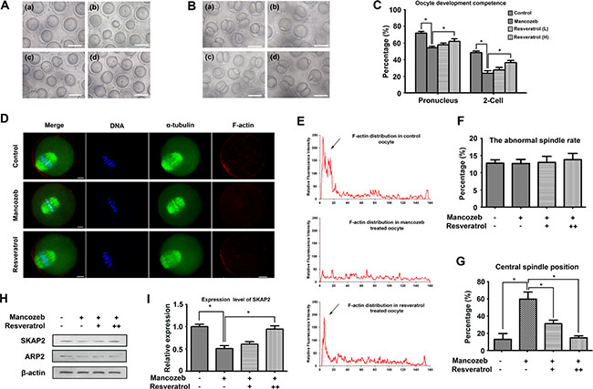 Figure 2: Effects of resveratrol on mancozeb affecting oocytes quality and developmental competence. (A) GV oocytes morphology from mice ovaries in different groups. Scale bar =100 μm. (B) Two-cell stage embryo morphology after parthenogenetic activation. Resveratrol treated oocytes exhibited a higher potential to reach the two-cell stage than that mancozeb treated, statistical analysis are showed in (C), Scale bar =100 μm. (D) Actin cap assembled at the cortex in normal oocytes but dispersed after mancozeb treatment. Recurrence of actin cap was observed after resveratrol treatment. Spindle did not show any difference in each group. Green, α-tubulin; Red, actin; Blue, DAPI staining of DNA. Scale bar = 20 μm. (E) Fluorescent intensity of F-actin in different oocyte areas in different groups. Arrows are zones of actin cap. (F) Percentage of oocytes with abnormal spindle formation in different groups. (G) Percentage of oocytes with centrally localized spindles in different groups. (H) Western blot of Arp2 and Skap2 protein levels in oocytes after different treatment. (I) Gray intensity of Skap2 in different groups.