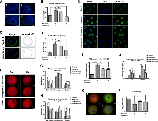 Figure 3: Effect of resveratrol on mancozeb induced ROS related apoptosis in ovary and oocyte. (A) Immunofluorescence images of terminal deoxynucleotidyl transferase-mediated dUTP nick-end labeling (TUNEL) (green) in ovaries. DNA stained with DAPI (blue). Scale bar = 100 μm (B) Percentage of follicles with positive TUNEL staining in different groups. (C) Immunofluorescence images of Annexin-V (green) in oocytes. Control oocytes exhibited fluorescence only in the zona pellucida, but early apoptositic oocytes exhibited fluorescence in both zona pellucida and membranes. Scale bar = 20 μm. (D) Percentage of oocytes with positive Annexin-V staining in different groups. (E) Detection of ROS levels using DCFH-DA probe. GV oocytes were cultured in M2 medium plus 0.1% DCFH-DA for 30 min. The fluorescence of the hydrolyzed product DCF (green) reflects ROS levels. Scale bar = 100 μm. (F) Effects of mancozeb and resveratrol on the distribution of mitochondria in meiosis. MitoTracker Red staining showed a perinuclear pattern of mitochondria in most of the control oocytes. This pattern was modified by mancozeb and resveratrol treatment. Scale bar = 20 μm. Statistical analysis of different mitochondrial distribution patterns in GV oocytes and MI oocytes in different groups are listed in (G) and (H). (I) ROS levels quantified from DCF fluorescence in (E) in different groups. (J) Anti-oxidant enzyme SOD and GSH-Px mRNA levels in oocytes from each group. (K) JC-1-stained mitochondria in GV oocytes. Mitochondria with high membrane potential showed a red fluorescence while those with low membrane potential showed a green fluorescence. Scale bar = 20 μm. (L) Red-green JC-1 fluorescence ratio in oocytes from different groups. (a) control group; (b) mancozeb treated group; (c) resveratrol (Low) group and (d) resveratrol (High) group. *P < 0.05.