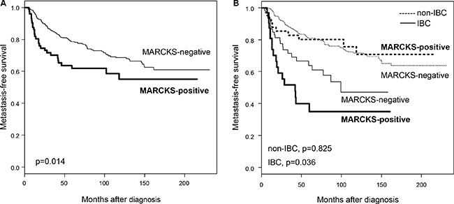 Figure 2: Metastasis-free survival according to MARCKS expression in the whole population and in IBC and non-IBC. (A) Kaplan-Meier MFS curves in patients with negative and positive expression in the whole population. (B) Similar to (A), but in patients with non-IBC (dashed lines) and patients with IBC (full lines). The p-values of log-rank test are indicated.