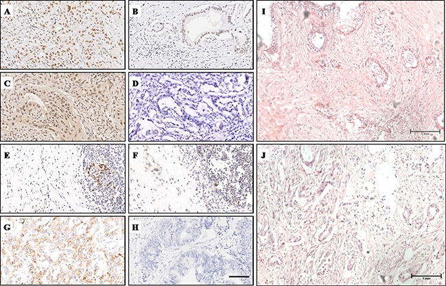 Figure 1: IHC and HE staining characteristics of MLH1, MSH2, PD-1, PD-L1 and stroma density. (A) High MLH1 expression was observed in the nucleus. (B) Low MLH1 expression. (C) High MSH2 expression was observed in the nucleus. (D) Low MSH2 expression. (E) PD-1 was located on cell menbranes of TILs, clusters of PD-1+ TILs were observed. (F) Sporadic PD-1+ TILs were observed. (G) High PD-1 expression was observed on cell menbranes of cancer cells. (H) Low PD-L1 expression. (I) H&E staining showed PC tissue with dense stroma. (J) H&E staining showed PC tissue with moderate stroma. Magnification, x200 (A–H); Magnification, x100 (I, J).