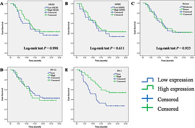 Immunohistochemistry (IHC) and haematoxylin-eosin (HE) staining results are summarized in Table 1 and Figure 1. At high magnification, MLH1 and MSH2 were distributed in the nucleus, while PD-1/PD-L1 was located on cell membranes. MLH1 was highly expressed in 63.8% (60/94) of PC samples (Figure 1A, 1B), while MSH2 was highly expressed in 75.5% (71/94) of PC samples (Figure 1C, 1D). High expression of PD-1 was observed in 46.8% (44/94) on tumor infiltrating lymphocytes (TILs) (Figure 1E, 1F). In contrast, PD-L1 was expressed on cell membranes of cancer cells with high expression in 28.7% (27/94) of PC tissues (Figure 1G, 1H). The density of tumor stroma was evaluated by haematoxylin-eosin staining. Dense stroma was observed in 55.3% (52/94) of cases (Figure 1I, 1J, Supplementary Figure S1).