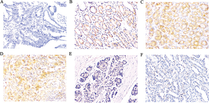 Figure 1: Immunohistochemical expression of Rap1GAP, E-cadherin and MMP2 in GC and para-carcinoma tissues. A. Slides without primary antibody served as the negative control in GC tissues, B, E. Typical immunohistologic features with Rap1GAP expression in para-carcinoma and GC tissues, the Rap1GAP staining localized predominantly in the cytoplasm. C, F. Typical immunohistologic features with E-cadherin expression in para-carcinoma and GC tissues. D. Immunostaining for MMP2 was performed in GC; Magnifications, ×200.