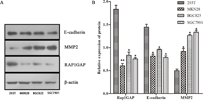 Figure 3: The protein expression of Rap1GAP, E-cadherin and MMP2. Rap1GAP and E-cadherin protein in GC cells were notably lower expression compared to 293T cells by western blotting. Conversely, MMP2 was upregulated in GC cells (*P < 0.05 and **P < 0.01)