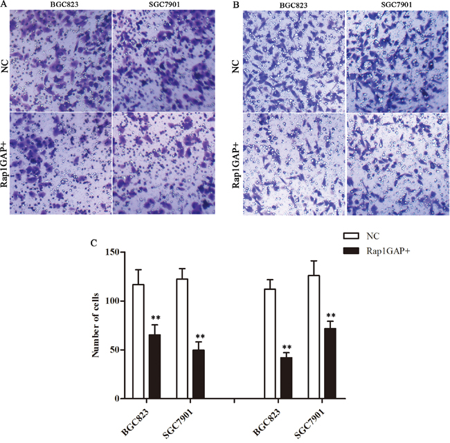 Figure 5: Overexpression Rap1GAP on the regulation of the migration and invasion capacity of tumor cells. Overexpression Rap1GAP repressed the migration A. and invasion B. capacity of GC cells C. The graph shows the quantified data of the assay, migration (left) and invasion (right) (**P < 0.01).