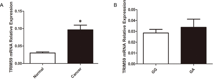 We wondered whether or not rs1141023 has an allele-specific influence on TRIM59 gene expression. The expression levels of TRIM59 mRNA were detected in forty-four pairs of cancerous and normal gastric tissues samples. Among the forty-four pairs of samples, thirty-four individuals carried the rs1141023 GG genotype, ten volunteers carried the GA genotype. Because of the limited number of AA genotype in general population, none of AA genotype was observed in above forty-four samples. As shown in Figure 1, TRIM59 mRNA level was highly overexpressed in cancerous tissues when compared with normal adjacent gastric tissues. There was no marked difference of TRIM59 mRNA between above two genotypes in normal gastric tissues.