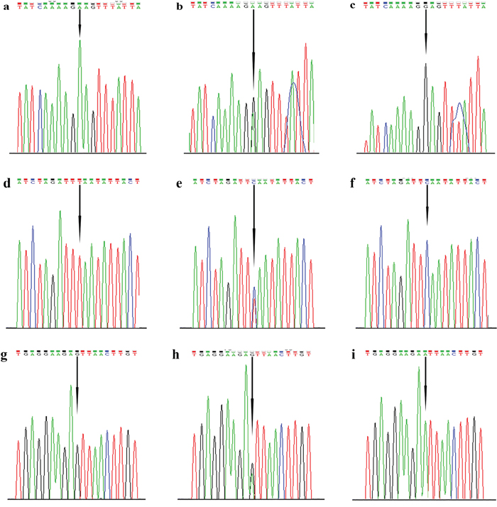 Figure 2: Direct sequencing results for tag SNPs in TRIM59 gene. The polymorphisms were detected by TaqMan probe and confirmed by direct PCR sequencing. The single base indicated with a black arrowhead is the variant site. a-c. The AA, GA and GG genotypes of rs7629 by direct DNA sequencing, respectively. d-f. The TT, TC and CC genotypes of rs11706810 by direct DNA sequencing, respectively. g-i. The GG, GA and AA genotypes of rs1141023 by direct DNA sequencing, respectively.