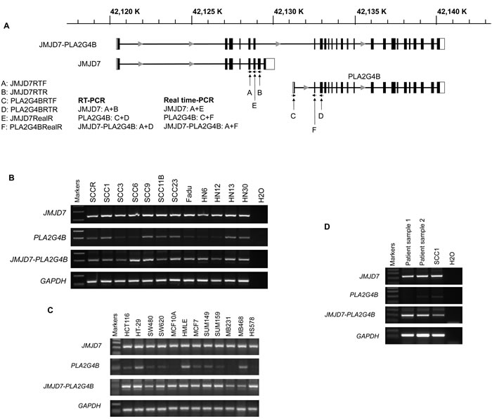Figure 1: JMJD7-PLA2G4B expression in HNSCC cells. A. Schematic presentation of gene structure of JMJD7, PLA2G4B, and read-through transcript JMJD7-PLA2G4B and location of the primer design site for each gene products, respectively. B. RT-PCR result of JMJD7, PLA2G4B, and JMJD7-PLA2G4B in HNSCC cell lines. C. RT-PCR result of JMJD7, PLA2G4B, and JMJD7-PLA2G4B in human colon and breast cancer cell lines and tissues. The representative results from three independent experiments are shown. D. RT-PCR result of JMJD7, PLA2G4B, and JMJD7-PLA2G4B in primary HNSCC tissues from patients.
