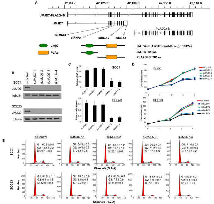 Figure 2: JMJD7-PLA2G4B is required for HNSCC cell proliferation and cell cycle progression. A. Schematic presentation of gene structure of JMJD7, PLA2G4B, and JMJD7-PLA2G4B and the protein domain structure of JMJD7, PLA2G4B, and JMJD7-PLA2G4B and the size of the product. The locations of regions where siRNAs were designed from are indicated. B. Western blotting of JMJD7 in SCC1 and SCC23 cells following transfection with siRNAs. α-tubulin was used as a loading control. C. qRT-PCR showing the mRNA level of JMJD7-PLA2G4B after siRNA transfection. Values are means ± S.D; ** p < 0.01. D. Knockdown of JMJD7-PLA2G4B using siJMJD-3 and siJMJD-4 decreased the proliferation rate of SCC1 and SCC23 compared to JMJD7 knodckdown (siJMJD7-1 and siJMJD7-2) alone and control. Values are means ± S.D. E. Flow cytometry analysis of SCC1 and SCC23 cells after JMJD7 or JMJD7-PLA2G4B knockdown using siRNAs.