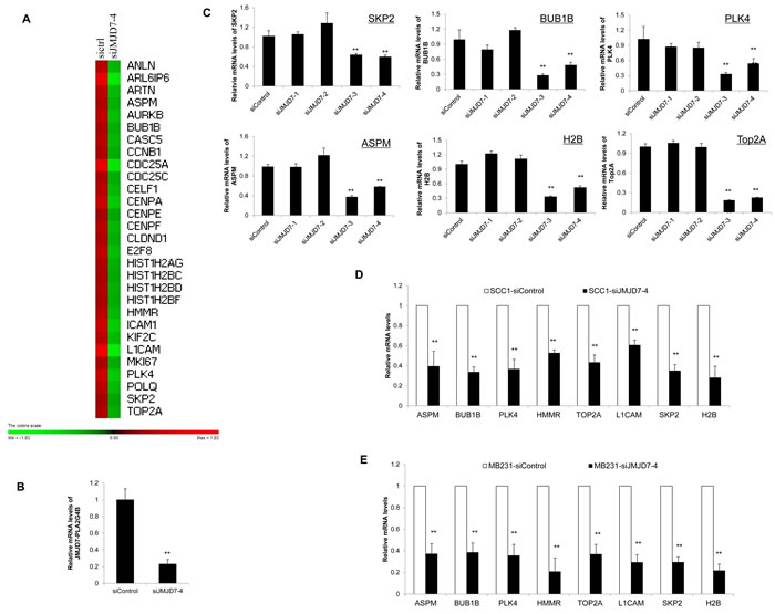For microarray, total RNA was extracted from SCC23 cells with miRNeasy kit following the manufacturer’s instruction (Qiagen) after 72 hours of transfection with scramble siRNA or siJMJD7-4, respectively. 5 µg aliquots of total RNAs were transcribed from each sample to double-stranded complementary DNA (cDNA) using SuperScript II RT (Invitrogen) with an oligo-dT primer and then used to generate single-stranded RNAs. The biotin-labeled RNAs were fragmented and hybridized with an Affymetrix Human Genome U133 Plus 2.0 Array at the UCLA DNA Microarray Facility. The arrays were scanned with the GeneArray scanner (Affymetrix). The robust multichip average (RMA) method was used to normalize the raw data. Heatmap of differential gene expression was generated using PermutMatrix v1.9.3 to reflect fold change relative to median expression of each gene in Log2 ratio [34]. The genes with more than 2-fold changes in expression were considered significant.