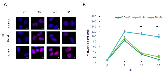 Figure 1: Persistent DNA damage induced by HU treatment. a. Formation of DNA double-strand breaks in DFSCs post HU treatment. DFSCs were treated with 0.5, 8 and 20mM HU for for 2 or 12 h and and allowed to recover until 36 h post treatment. Cells were fixed and stained for γH2AX foci (red) at the indicated time points post HU treatment. Scale bar: 5 mm. b. Graphical depiction of the number of γH2AX foci in DFSCs treated with 0.5, 8 and 20mM HU over 36 h. Data are expressed as mean±S.E. from three independent experiments. *P < 0.05, **P < 0.01, two-way ANOVA with Fisher’s post hoc test