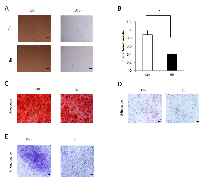 Figure 2: Proliferation and differentiation of HU-treated DFSCs. a. In vitro proliferative capacity of DFSCs assayed by colony formation experiment. Representative images of colony from control (Con) and HU-treated (HU) cells. The number of colony formed after 10 days was counted. D0 shows the plated DFSCs after single-cell dissociation at day 0. D10 shows the colony formed after 10 days of culturing. Scale bar: 50 mm. b. In vitro proliferative capacity of DFSCs assayed by colony formation experiment. The number of DFSCs formed after 10 days was counted. Statistics for the ratio of DFSCs formation after 10 days in vitro. Mean±S.E. from three independent experiments. *P < 0.05, Student’s t-test. c. After Osteogenic differentiation, DFSCs with and without HU treatment were analyzed by Alizarin Red staining after 3 weeks of culture (scale bar 50 μm). d. At day 14 after induction of differentiation, DFSCs with and without HU treatment was stained with Oil Red O (scale bar 50 μm). e. After Chondrogenic differentiation, DFSCs with and without HU treatment were stained with Alcian blue in combination with PAS (Periodic acid-Schiff) in an automated slide stainer and photo-documented (scale bar 50 μm).