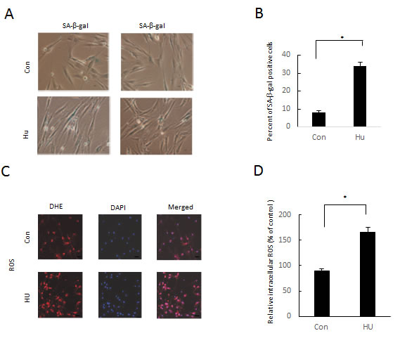 Figure 3: Phenotypic characterization of 8 mM HU-treated DFSCs. a. Images of SA-β-gal+ DFSCs. with or without HU treatment. b. Statistics of the percentage of SA-β-gal+ DFSCs, mean±S.E. *P < 0.05, Student’s t-test, Scale bar: 50 mm. c. ROS were detected using dihydroethidium (DHE) fluorescence. d. ROS level was normalized to that of control cells with statistics expressed as mean±S.E. *P < 0.05, Student’s t-test. Scale bar: 60 mm.