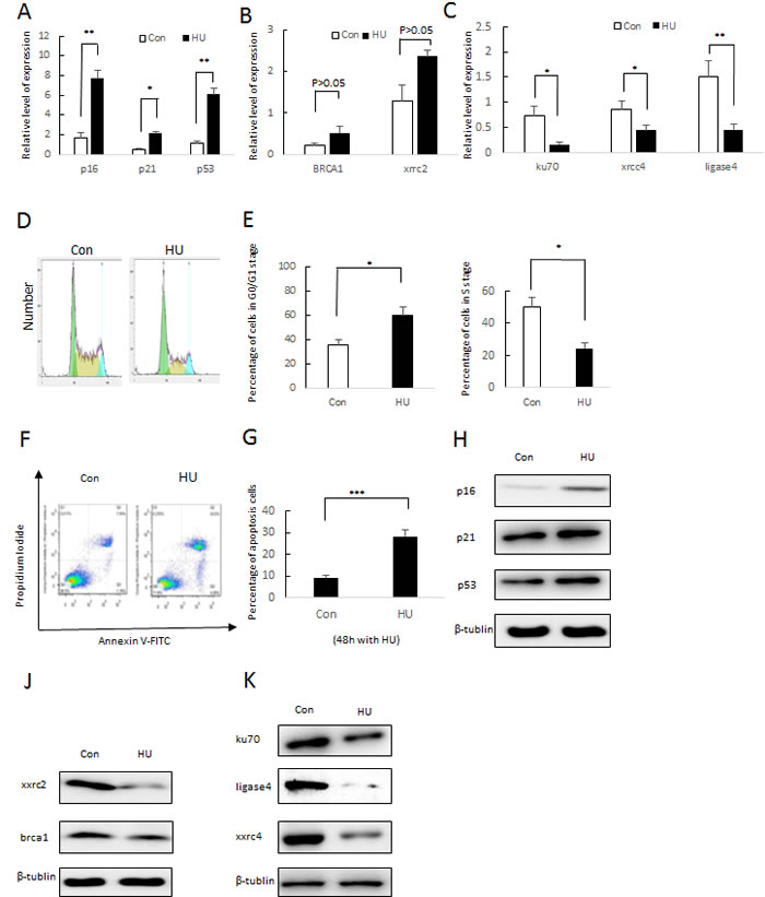 Figure 4: Molecular characterization of 8 mM HU-treated DFSCs. a. qRT-PCR analysis of p16, p21 and p53 expression normalized by β-actin. Values represent mean±S.E. of two independent samples conducted in triplicate. *P < 0.05; **P < 0.01, Student’s t-test. b. qRT-PCR analysis of HR (X-ray repair cross complementing 2 (xrcc2) and brca1) and NHEJ (ku70, ligase4 and X-ray repair cross complementing 4 (xrcc4)) gene expression normalized by β-actin c. Values represent mean±S.E. of two independent samples conducted in triplicate. *P < 0.05; **P < 0.01, Student’s t-test. d. Cell cycle arrest of DFSC cells was were treated with 8 mM HU and without HU (Con). After 24 h of incubation, cells were harvested and stained with PI followed by Cellometer imaging and analysis. X-axis indicated the PI fluorescence intensity that correlates to the DNA content. e. FACS analysis and percentages of different cell stages are presented as mean of percentage±S.E. . f. DFSC cells were treated with HU (8 mM) and without HU for 48 h and examined by flow cytometry using Annexin-V/PI staining to label apoptotic cells. g. FACS analysis and percentages of apoptotic cells are presented as mean of percentage±S.E. .(f) Western blotting analysis of p16 and p21 expression. (g) Western blotting analysis of xxrc2 and brac1 expression. (j) Western blotting analysis of ku70, ligade4 and xxrc4 expression