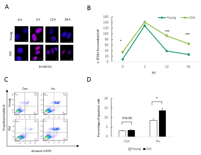 Figure 5: Phenotypic and molecular characterization of 8mM HU-treated DFSCs between Young and Old. a. Formation of DNA double-strand breaks in DFSCs post HU treatment. DFSCs were treated with 0.5, 8 and 20mM HU for for 2 or 12 h and and allowed to recover until 36 h post treatment. Cells were fixed and stained for γH2AX foci (red) at the indicated time points post HU treatment. Scale bar: 5 mm. b. Graphical depiction of the number of γH2AX foci in DFSCs treated with 0.5, 8 and 20mM HU over 36 h. Data are expressed as mean±S.E. from three independent experiments. *P < 0.05, **P < 0.01, two-way ANOVA with Fisher’s post hoc test. c. DFSC cells were treated with 8 mM HU for 48 h and examined by flow cytometry using Annexin-V/PI staining to label apoptotic cells. d. FACS analysis and percentages of apoptotic cells are presented as mean of percentage±S.E. .