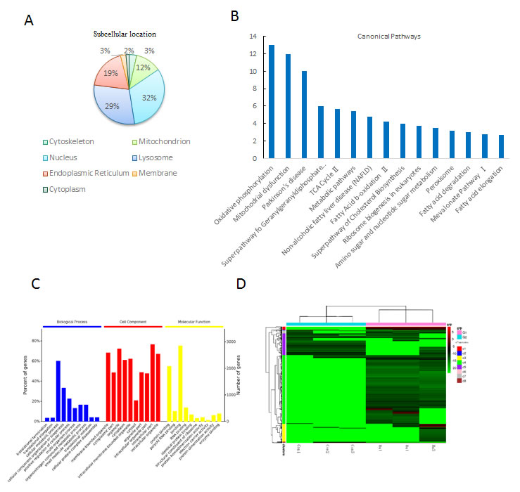 Figure 6: Biological function analysis of the differentially expressed proteins post HU treatment. a. The cellular component annotations of differentially expressed proteins with GO analysis from DAVID database. b. Top canonical pathways altered post HU treatment with mitochondrial dysfunction being the most significant one. c. GO annotation of identified age-related proteins in three categories: biological process (BP), cellular component (CC) and molecular function (MF). d. Heat map visualization of significantly regulated probe sets. A hierarchical clustering was analyzed on the probe sets and gene transcripts were selected from 6 chips in 2 arrays (Con and HU treatment) through a filter criteria of at least 2-fold changes with P≤0.05 (F test). Columns: samples; rows: genes; color key indicates gene expression value, green: lowest, red: highest.