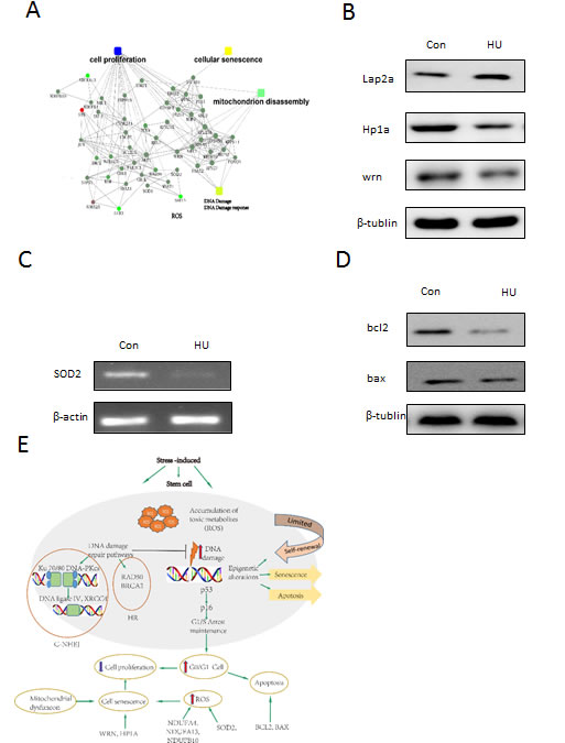 Figure 7: Candidate genes and pathways identified through the DFSC cellular aging model associated with aging characteristics. a. The key regulatory networks underlying the HU-induced aging model. Proteomic data were imported into the IPA and interacting pathways were constructed in protein expression. b. Western blotting analysis of lap2a, hp1a and wrn expression. c. Verification of SOD2 expression by RT-PCR with β-actin as an internal control. The data are presented as mean±S.E. from three independent experiments. d. Western blotting analysis of bal2 and bax expression. e. The schematic diagram outlines the key players and pathways that may mechanistically contribute to the phenotypes in our DFSC aging model.