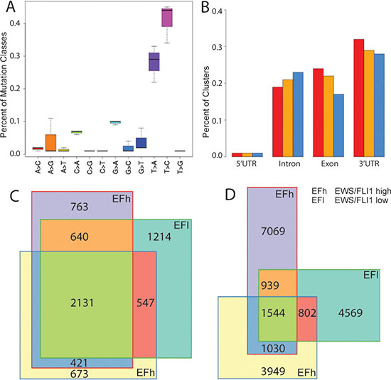 To characterize the full complement of endogenous miRNA-mRNA complexes in A673/TR/shEF EwS cells, we performed PAR-CLIP under EWS-FLI1 high and low conditions monitoring target transcripts associated with the RNA-binding component of the functional RISC complex, AGO2. Indicative of specific AGO2/mRNA cross linking, a high T to C conversion rate of at least 35% was observed in all samples (as compared to 10–20% previously reported by Hafner et al. for non-irradiated 4SU-containing oligoribonucleotides (Figure 2A) [12]. Also, 3’UTRs were highly overrepresented in the clusters identified by PARalyzer, a versatile tool for mapping high-confidence sites from PAR-CLIP deep-sequencing data [22] (Figure 2B). Overall, 7860-10601 clusters from PARalyzer mapped to 3′UTRs and also fulfilled further quality filters (Supplementary Table S2, see M&M). These clusters were contained in 3955-4532 genes. 2131 of these genes had PARalyzer clusters in all three experiments, and 1583 clusters overlapped exactly (min 10bp overlap). Interestingly, concerning pairwise overlaps, the two replicas without knockdown of EWS-FLI1 had a very similar percentage of shared genes (64%) and clusters (32%) as each of these experiments with the EWS-FLI1 knockdown experiment (genes: 53%/70%, clusters:32%/35%, calculated with respect to the smaller set, Figure 2C, 2D). This result indicated that the silencing of EWS-FLI1 did not have a large influence on the spectrum of AGO2 binding sites on mRNAs as identified by PAR-CLIP. Since the method does not allow drawing any quantitative conclusions, we did not distinguish between the two conditions and treated them as replicates for the remainder of this study