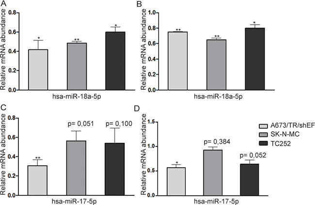 Figure 5: miRNA overexpression in three EwS cell lines. miRNA mimics (hsa-miR-18a-5p and hsa-miR-17-5p) and a negative control mimic were transfected in A673/TR/sheEF, SK-N-MC and TC252 EwS cell lines, and qPCR was performed for (A) CTGF, (B) FOSL2, (C) GBP3 and (D) SERPINE1. Relative mRNA abundance is calculated against negative control mimic. Means and standard deviations of at least three independent experiments, each performed in triplicate, are shown.