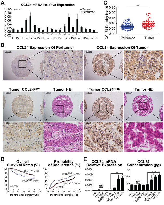 Figure 1: CCL24 expression in HCC tissues and HCC cell lines. A. CCL24 mRNA expression in 20 fresh HCC tumors and adjacent normal tissues. B. Representative photomicrographs of peritumor and tumor tissues showed CCL24 expression (brown staining in the cytoplasm of cells). Scale bar, 40×, 500 um; 400×, 500 um. C. Density analysis showed statistical significance of CCL24 expression of 70 cases of patients in TMA samples. D. Prognostic values of CCL24 expression using Kaplan-Meier analysis. E. qRT-PCR analysis and ELISAs of CCL24 expression in normal liver cell (L02) and seven HCC cell lines (Hep3B, HepG2, SMMC-7721, Huh7, MHCC-97L, MHCC-97H, HCCLM3). Data shown were means (±SD) from three independent experiments. *P< 0.05, **P< 0.01, ***P<0.001.