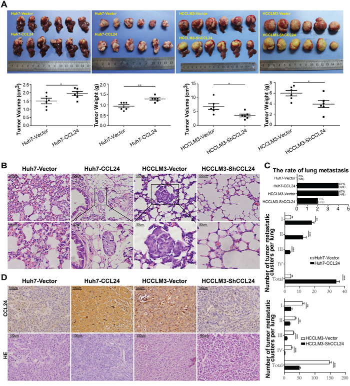 Figure 3: CCL24 promotes HCC progression in a xenograft nude mice model. A. Liver bearing tumors formed by implanted cells with different expression levels of CCL24. Weights and tumor volume of the tumors in livers of nude mice were measured. Error bar indicates standard deviation (n=6). B. H&E-stained images of metastatic nodules in lungs from all groups with magnification of the selected areas. Scale bar, 200×, 100 um; 400×, 50 um. C. The counts of tumor rates, metastatic clusters in lung from all xenograft nude mice groups. D. Representative images from tumor serial sections stained with CCL24 by immunohistochemistry. Scale bar, 200×, 100 um. *P< 0.05, **P< 0.01, ***P<0.001.