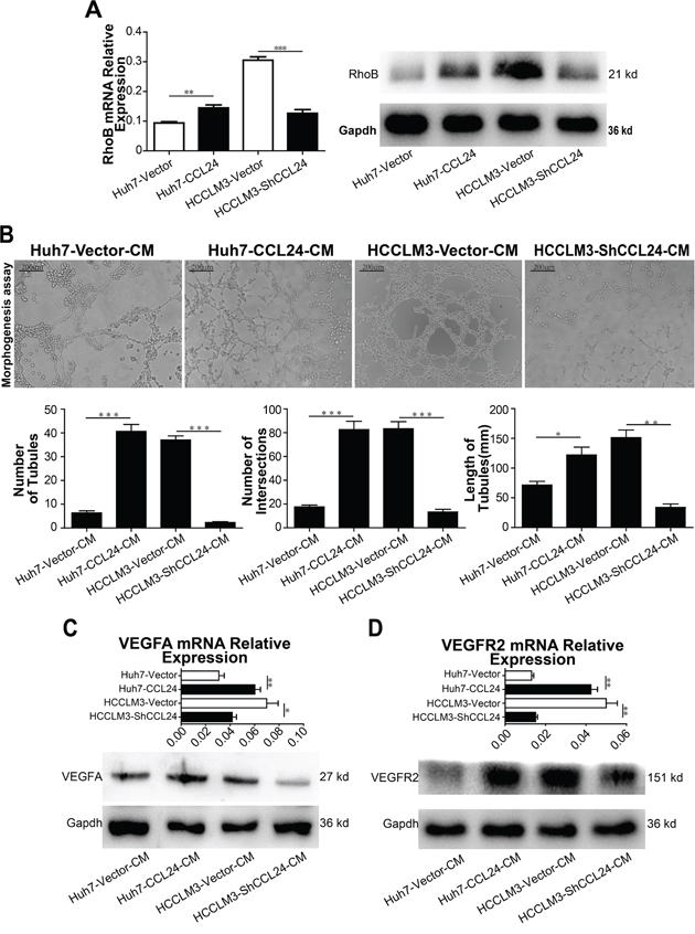 Figure 4: CCL24 promotes migration and invasion of HUVECs and VEGFA signaling pathway. A. qRT-PCR, western blot analysis of RhoB expression in transfected cells. B. Tube formation assay was used to determine the ability of HUVECs to form capillaries after adding different conditioned mediums, and analyzed number of tubules, number of intersections, and length of tubules of different groups. Scale bar, 100×, 200 um. C-D. qRT-PCR, western blot analysis of VEGFA, VEGFR2 expression in transfected HCCs. Data shown were means (±SD) from three independent experiments. *P< 0.05, **P< 0.01, ***P<0.001.