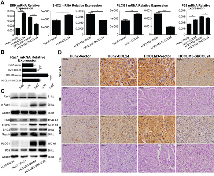 Figure 5: Mechanism of CCL24 promotes HCC cells migration, invasion, and HUVECs angiogenesis via RhoB. A, B. qRT-PCR analysis of ERK, SHC2, PLCG1, P38, Rac1 expression in transfected cells. C. Western blot analysis of Rac1, p-Rac1, ERK, p-ERK, SHC2, PLCG1, P38 expression in transfected cells. D. Representative images from tumor serial sections stained with VEGFA, RhoB by immunohistochemistry. Scale bar, 200×, 100 um. Data shown were means (±SD) from three independent experiments. *P< 0.05, **P< 0.01, ***P<0.001.