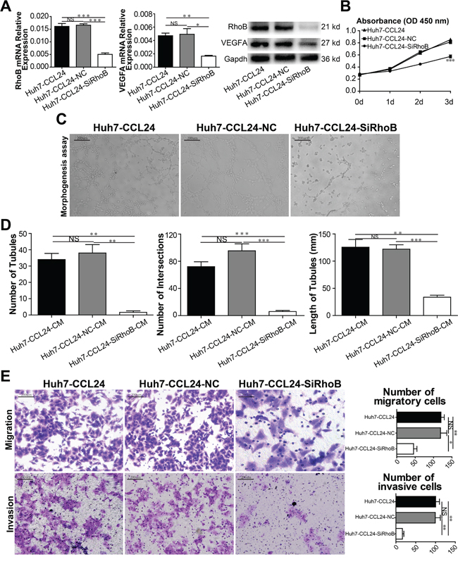While RhoB may participate in CCL24-mediated malignancy, it was unclear whether RhoB would play a role in the biological behavior of HCC cells or the expression of VEGFA. Therefore, we knocked down RhoB in Huh7-CCL24 and HCCLM3 using RNA interference. We found that VEGFA was concomitantly varied in line with RhoB (p=0.0001, p=0.0009, Figure 6A; p=0.0009, p=0.0021, Supplementary Figure S6A). Meanwhile, the difference in the cell proliferation of Huh7-CCL24 and Huh7-CCL24-SiRhoB was statistically significant on day 3 (p<0.0001, Figure 6B; the same result was shown in the HCCLM3 group in contrast to the HCCLM3-SiRhoB group, p<0.0001, Supplementary Figure S6B). The role of tube formation in HUVECs by different conditional media of Huh7-CCL24, Huh7-CCL24-NC, Huh7-CCL24-SiRhoB supernatants were also expectedly significant (The P values for the number of tubules, the number of intersections, and the length of tubules were, respectively: p=0.0023, p=0.0011, p=0.001, p=0.0009, p=0.0006, p=0.0032, Figure 6C, 6D; the same finding was also observed in HCCLM3 cells: p=0.0016, p=0.0269, p=0.001, p=0.0045, p=0.0005, p=0.0001, Supplementary Figure S6C, S6D). In addition, the migration and invasion ability of Huh7-CCL24, Huh7-CCL24-NC, and Huh7-CCL24-SiRhoB were also statistically significant (The P values for migration and invasion were p=0.0196, p=0.0044, p=0.0034, p=0.0012, respectively. Figure 6E; the same results were observed in HCCLM3 cells: p=0.0008, p=0.0011, p=0.0138, p=0.0428, respectively. Supplementary Figure S6E).