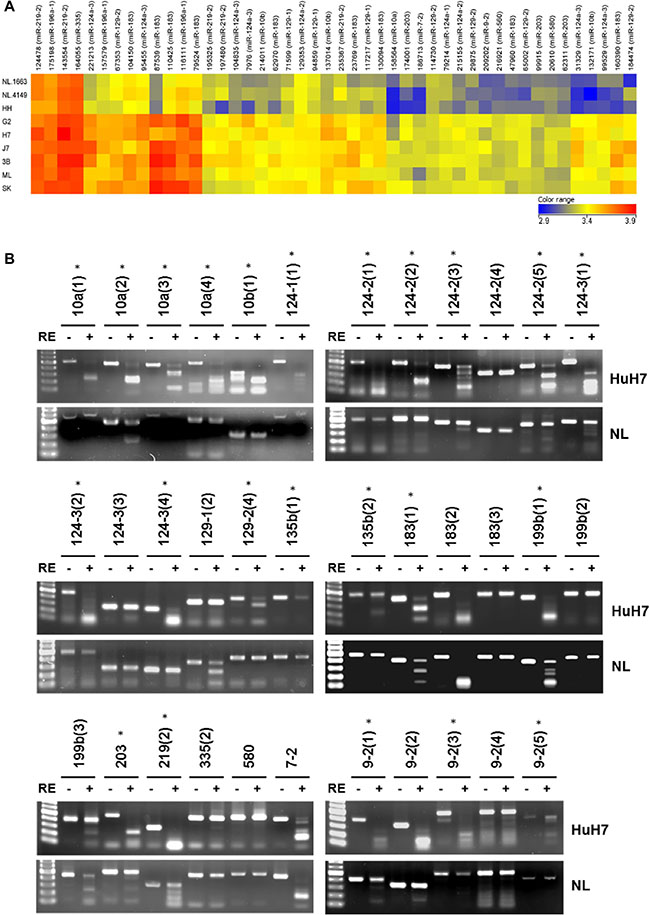 Figure 1: Differential DNA methylation profile of miRNAs in normal livers and HCC cells. (A) Unsupervised hierarchical cluster analysis of the CpG microarray data from two normal liver tissues (NL-1663 and NL-4149), one normal liver cell (HH) and six HCC cells (G2, H7, J7, 3B, ML, SK). Each row represents a sample, and each column represents a miRNA. The color score (bottom right) depicts the log-transformed and normalized intensity. Hyper-methylated and hypo-methylated miRNAs are indicated in red and blue, respectively. The abbreviations of HCC cell lines are as follows: G2, HepG2; H7: HuH7; 3B, Hep3B; ML, Mahlavu; SK, SK-Hep-1. (B) The results of COBRA in HuH7 and normal liver (NL). Following PCR amplification of sodium bisulfite-converted DNA, PCR products were incubated with or without restriction enzyme (RE) as indicated by plus or minus sign. Different regions of the same miRNA are shown as parentheses. Lane 1, 100-bp DNA marker. Stars represent significant hypermethylation in HuH7.
