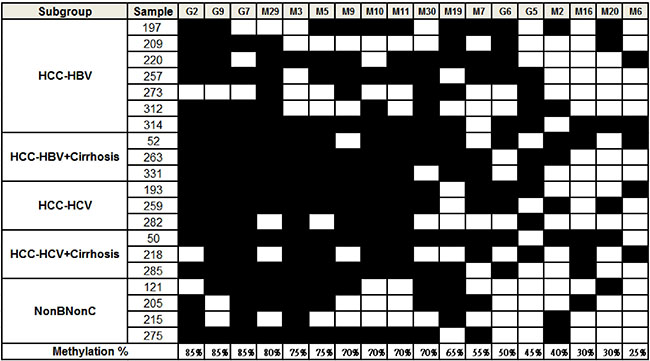 Figure 2: Methylation status of candidate miRNAs and genes in HCC tissues. HCC samples were classified into 5 groups as shown in the first column. The filled squares represent the higher methylation level in tumor and the open squares represent the higher methylation level in adjacent normal tissue. The percentage of methylated samples (tumor vs. adjacent normal) was calculated and shown at the bottom. The codes are as follows: G2: RASSF1A, G9: RUNX3, G7: APC, M29: miR-589, M3: miR-10b (C), M5: miR-203, M9: miR-124-3 (A), M10: miR-124-3 (B), M11: miR-124-3 (D), M30: miR-589 (C), M19: miR-647, M7: miR-129-2, G6: COX2, G5: CDKN2A, M2: miR-10b (A), M16: miR-671, M20: miR-335, M6: miR-339B.