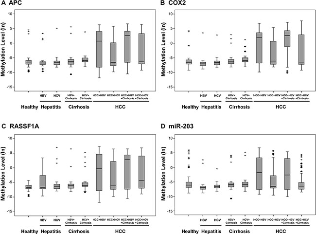 Figure 3: Methylation levels of candidate genes and miRNAs in clinical plasma samples. Methylation levels of (A) APC, (B) COX2, (C) RASSF1A, and (D) miR-203 were determined by qMSP in plasma samples from healthy controls (n = 50) and patients with hepatitis (including hepatitis B and hepatitis C; n = 47), hepatitis with cirrhosis (including hepatitis B and hepatitis C; n = 57) and HCC (HBV-related, HBV-related with cirrhosis, HCV-related and HCV-related with cirrhosis; n = 203). Methylation levels were transformed by log 2 and depicted by box plots. Boxes extend from 25th to 75th percentiles and are divided by a solid line that represents the median of each group and a diamond that represents the mean of each group. Whiskers extend from the 5th to the 95th percentiles. Each outlier is denoted by a dot. F test was used to determine statistical significance.