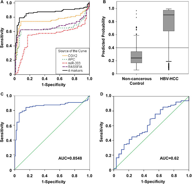 Figure 4: Receiver operator characteristic (ROC) curves for the diagnosis of HBV-related HCC versus non-cancerous control. (A) ROC curve analysis for APC [AUC=0.644], COX2 (AUC = 0.758), RASSF1A (AUC = 0.666), miR-203 (AUC = 0.55) and the four candidate combination (AUC = 0.865). (B) A MPM-B cut-off value of 0.4 for differentiating between HBV-related HCC and non-cancerous control. (C) ROC curve for leave-one-out cross-validation of MPM-B (AUC = 0.8548). (D) ROC curve for serum AFP to discriminate between HBV-related HCC and non-cancerous control (AUC = 0.62).