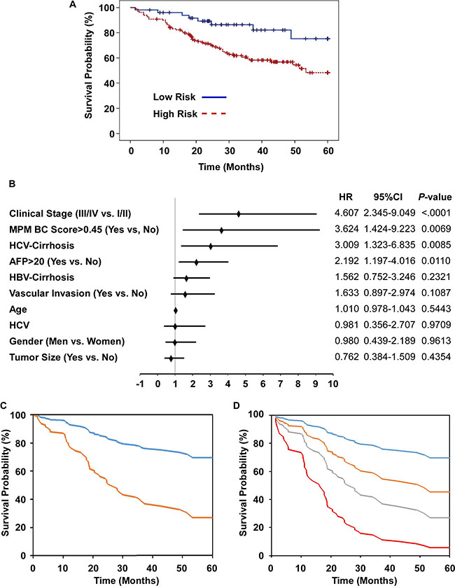 Having tested the diagnostic efficacy of the methylation markers for HCC, we analyzed the prognostic capability for the methylation prediction model in a retrospective cohort of 241 HCC patients with chronic HBV with or without HCV infection (180 patients survived to the end of the follow-up period). The logistic regression model was used to establish a methylation predictive model BC (MPM-BC) and the relationship between clinico-pathological characteristics and overall survival was statistically determined by the Log-Rank test. Based on the univariate analysis, the significant prognostic factors for survival included cirrhosis (P = 0.0086), the histologic grade (P = 0.0382), AFP (P < 0.0001), the pathological stage (P = 0.0054), the clinical stage (P < 0.0001), vascular invasion (P < 0.0001) and the MPM-BC (P = 0.0052) (Table 2). Further, the HCC patients were subdivided into high- and low- risk groups based on the MPM-BC cutoff value of 0.45. Based on the Kaplan-Meier survival curves, the 5-year survival rates for the high- and the low-risk groups was 48.3% and 75.2%, respectively (Figure 6A). We further analyzed the various clinico-pathological factors like age, gender, AFP, vascular invasion, tumor size, the clinical stage, the viral cirrhosis group and the MPM-BC by using the multivariate Cox proportional hazard model and found that the clinical stage (P < 0.0001), MPM-BC (P = 0.0069), the viral cirrhosis group (P = 0.0085) and AFP (P = 0.011) were statistically significant for overall survival (Table 3). The Cox proportional hazards model also showed that the Clinical stage III/IV (HR, 4.607; 95% CI, 2.345–9.049), the HCV-related HCC with cirrhosis subgroup (HR, 3.009; 95% CI, 1.325–6.835), > 20 ng/mL AFP (HR, 2.192; 95% CI, 1.197–4.016) and the high risk group of MPM-BC (cut-off value > 0.45) (HR, 3.624; 95% CI, 1.424–9.223) were associated with high mortality rates (Figure 6B). Additionally, we analyzed the overall survival of the high- and low-risk groups stratified by the MPM-BC using the fitted Cox proportional hazard model and Breslow estimate of the background hazard. The co-variate adjusted survival curves showed that the average 5-year survival probability of the high- and the low-risk groups were 26.94% and 69.63%, respectively (Figure 6C). Comparatively, patients with MPM-BC ≤ 0.45 and AFP ≤ 20 ng/mL exhibited the survival rate of 69.63%, whereas, patients with MPM-BC > 0.45 and AFP > 20 ng/mL had a low survival rate of 5.64% (Figure 6D). Also, since the patients with MPM-BC ≤ 0.45 and AFP > 20 ng/mL exhibited a relatively higher 5-year survival rate than that of the patients with MPM-BC > 0.45 and AFP ≤ 20 ng/mL as shown in Figure 6D, it showed greater prognostic potential of MPM-BC for HCC patients.
