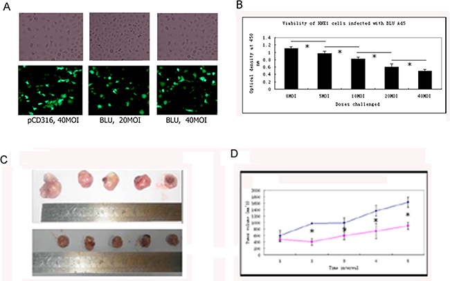 Figure 1: Growth inhibitory effects on HNE1 cells exerted in vitro and in vivo by BLU. A. Re-expression of BLU was confirmed the presence of green fluorescence viewed with microscopy. B. Growth inhibitory effect of BLU on HNE1 cells was measured with CCK8 kit. Significant differences was suggested by P<0.05 depicted with an asterisk (*). C. Growth of xenografted HNE1 cells was inhibited by BLU in Balb/C mice. Two weeks after subcutaneously inoculation, palpable tumors were identified. Recombinant BLU Ad5 and the control adenovirus with pCD316 were injected intratumorally. The long and short radiuses were measured with caliber every other day. The mice were sacrificed after two-week observation. The tumors were harvested by surgical removal and photographed (C); Upper panel: control group with injection of pCD316 Ad5; lower panel: experimental group with injection of BLU Ad5; D. The tumor volumes were calculated according to the formula v=ab2/2; a and b were the long and short radiuses mentioned above. The growth curve was plotted according to the tumor size registered every other day. Data derived from tests with three groups each containing 6 mice and presented as mean ± SD. The asterisk (*) in D depicted p< 0.05 in statistics.
