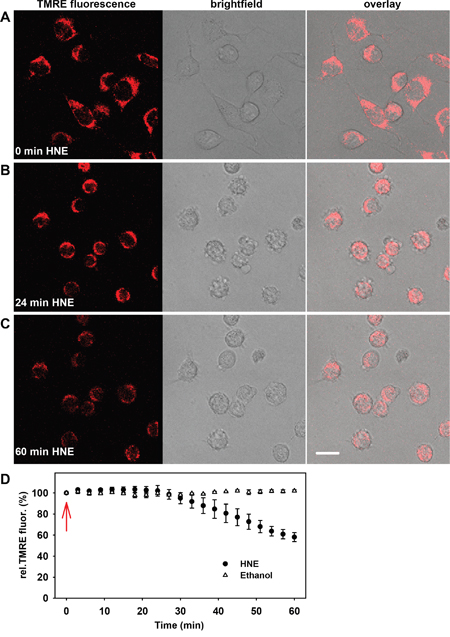 Figure 1: Alteration of the mitochondrial membrane potential and cellular morphology after addition of 4-hydroxy- 2-nonenal (HNE) to N18TG2 neuroblastoma cells in a typical experiment. A-C. Fluorescence (left), brightfield (middle) and merged (right) images of the cells were recorded A. without HNE, B. 24 minutes and C. 60 minutes after addition of 16 μM HNE. Cell medium contained 21.6 mM glucose, 3.85 mM glutamine, 9.6% fetal bovine serum and 1.92 mM sodium pyruvate. Scale bar is 20 μm. D. Time course of normalized TMRE fluorescence after addition of 16 μM HNE and ethanol as a control (arrow). TMRE fluorescence was normalized to the fluorescence at time point 0 min. Data are presented as mean values ± SEM from at least 5 independent experiments.